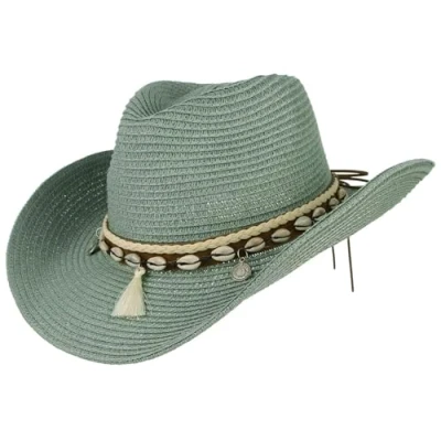 GEMVIE Women's Summer Straw Cowboy Cowgirl Hat Sun Hats Wide Brim Beach Holiday with Shell Band Green