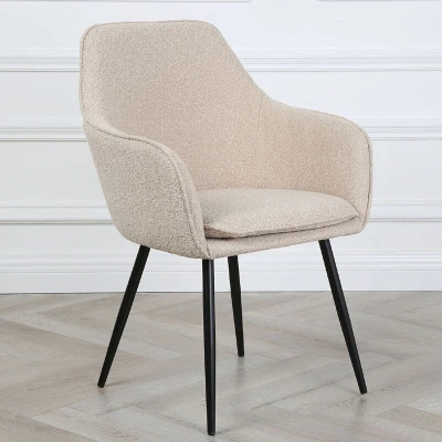 General description This exquisite Genesis Muse Chair in Boucle Fabric features a stunning cream upholstery that elevates the aesthetic of any space, making it a focal point of sophistication. With a sleek metal frame, this chair offers sturdy support and lasting durability, while the plush cushioning provides luxurious comfort. Its ergonomic design, including a curved backrest and armrests, cradles your body, making it ideal for unwinding, reading, or enjoying moments of tranquility. The lush Boucle fabric adds a tactile dimension, and the cream color brings style and playfulness to your living room, bedroom, or home office. Technical specifications Weight: 5.5 kg Upholstery: Boucle fabric Legs: Black finish metal tube legs Features: Non-slip feet Installation Easy to assemble Other information Colours may differ slightly depending on screen contrast/room lighting Please see pictures for detailed measurements