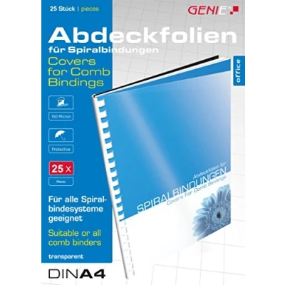 Pack of 25 clear binding covers. Suitable for all DIN A4 binding devices (manufacturer-independent) - Original binding device accessories from Genie Format: DIN A4 format (30 cm) Design: transparent film (transparent and glossy) with a film thickness of 150 µm (micron / mic) Design and bind your menus, calendars, recipe books, photo albums, brochures, reports, statistics, application folders, project folders, presentation folders, bachelor thesis, master thesis, doctoral thesis, etc. yourself Box contents: 1 x pack of 25 Genie cover sheet/transparent film (item number: 12385)