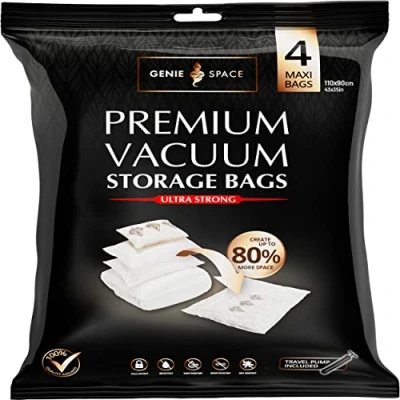 GENIE Space Max Vacuum Bags Pack of 4, Size Strong XXL Jumbo Saving Storage Bag, 43x35in Premium Airtight & Reusable Bag for Duvets, Curtains, Clothes, Coats, Jumpers Pillows