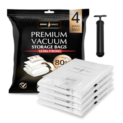 4-PACK MAXI SET: Includes four premium 110x90cm vacuum storage bags and a hand travel pump. Perfect for storing duvets, pillows, blankets and bulky clothes while saving valuable wardrobe, drawer and suitcase space. BUILT TO LAST, DESIGNED FOR REUSE: Made from extra-thick 110-micron material, these durable airtight vacuum storage bags resist rips, tears and air leaks for reliable long-term use — a reusable, eco-friendly alternative to single-use plastic storage. LOCKED TIGHT, KEEPS ITEMS PROTECTED: These space saver bags feature a double zip seal and anti-leak valve for airtight protection that blocks out dust, moisture and odours, keeping your belongings clean, fresh and ready for any season. UNLOCK MORE SPACE: Compress bulky items by removing air and create up to four times more storage with these vacuum-sealed storage bags — ideal for wardrobes, under-bed storage and even your suitcase. EASY TO USE, COMPATIBLE WITH ANY VACUUM: Open, pack, seal and remove air effortlessly using any standard vacuum cleaner or hand pump — simple, reusable storage that helps you stay organised and reduce waste at home or away.