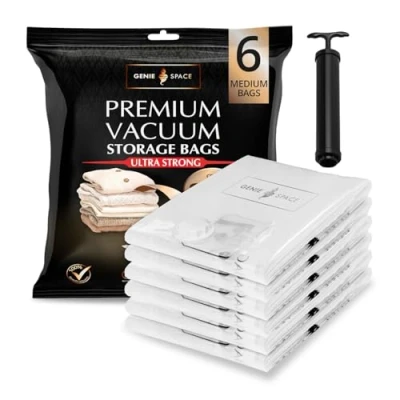 6-PACK MEDIUM SET: Includes six premium 70x50cm vacuum storage bags and a hand travel pump. Perfect for storing clothes, jumpers, towels and soft furnishings while saving valuable wardrobe, drawer and suitcase space. BUILT TO LAST, DESIGNED FOR REUSE: Made from extra-thick 110-micron material, these durable airtight vacuum storage bags resist rips, tears and air leaks for reliable long-term use — a reusable, eco-friendly alternative to single-use plastic storage. LOCKED TIGHT, KEEPS ITEMS PROTECTED: These space saver bags feature a double zip seal and anti-leak valve for airtight protection that blocks out dust, moisture and odours, keeping your belongings clean, fresh and ready for any season. UNLOCK MORE SPACE: Compress bulky items by removing air and create up to four times more storage with these vacuum-sealed storage bags — ideal for wardrobes, under-bed storage and even your suitcase. EASY TO USE, COMPATIBLE WITH ANY VACUUM: Open, pack, seal and remove air effortlessly using any standard vacuum cleaner or hand pump — simple, reusable storage that helps you stay organised and reduce waste at home or away.