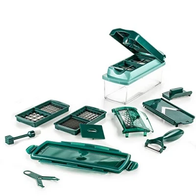 The Nicer Dicer Plus is an innovative multi-purpose appliance for the modern kitchen and a perfect aid to a healthy daily diet. Self-cleaning: by pressing the “push” button, the built-in transparent cleaning plate is automatically pushed down and cleans even the smallest food remnants from the grater. Extremely sharp blade inserts made from stainless steel in G-NOX quality with 2 different edges for simultaneous cutting of any kind of food. Wide selection of cutting variations: small, medium and large dice, cut into cubes, slices quarters and eighths. Wide selection of cutting variations: small, medium and large dice, cut into cubes, slices quarters and eighths. Collection container with an air-tight lid for cutting directly into, space-saving storage (stackable) for keeping things fresh and for transportation.