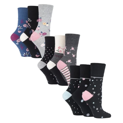 Gentle Grip 9 Pair Multipack Ladies Cotton Crew Non Elastic Socks Womens Soft Top Striped Patterned Binding (4 8, Floral Spot)