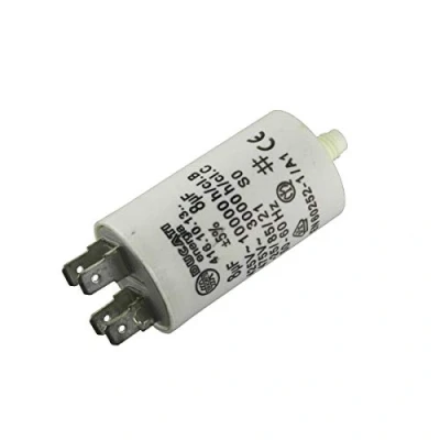Genuine Indesit capacitor 8uF / 8MFD, 450VAC Commercial reference : C00196906 Case Dimensions : 55mm long, 33mm diameter. 2 double 6.5mm faston male spade connectors at one end, and a 8mm stud at the other.