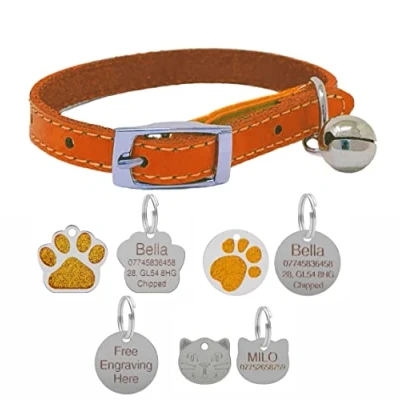 Genuine Leather Cat Collar with Safety Elastic & Bell Optional Personalised Engraved Tag (Orange, 22mm Face Tag)