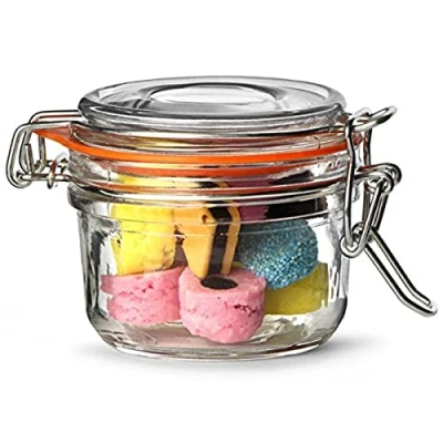 Clip top jar Material: Soda-lime glass Secure metal clip with orange rubber seal Airtight seal Dishwasher safe