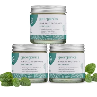 100% NATURAL TOOTHPASTE AND EFFICIENT: Georganics mineral toothpaste is a coconut oil toothpaste specially developed to cleanse and remineralise teeth naturally. This toothpaste has been approved by dentists and has ingredients that are high in key minerals and free from fluoride including, SLS and glycerine. The toothpaste provides all-day protection and removes surface stains without being harsh on teeth. This 100% natural toothpaste is spearmint flavoured. NATURAL WHITENING: Formulated with mineral-rich ingredients, this natural toothpaste contains a non-foaming formula of mineral-rich powders calcium carbonate and kaolin clay which support the natural remineralisation process, whilst gently polishing, detoxifying, strengthening and refreshing teeth. With consistent use of the toothpaste it will remove surface stains, creating a brighter smile without damaging the enamel. COSMOS NATURAL, VEGAN & CRUELTY-FREE: Replace your toxic mainstream toothpaste and switch to our Georganics COSMOS certified mineral toothpaste. Formulated without the use of nasty chemicals or synthetic additives, Georganics mineral toothpaste is made from 100% natural ingredients and is certified COSMOS, vegan and cruelty-free. Prioritise your oral health using our toothpaste, to achieve fantastic results. HANDMADE IN THE UK, ECO-FRIENDLY: This Georganics range has been produced in the UK and is recyclable, biodegradable and plastic-free. The range of natural oral-care products has been made to have as little impact as possible on the environment. This organic mineral toothpaste comes in zero waste packaging glass jar, made from recyclable materials. Georganics products are made from locally sourced ingredients to support UK businesses. Handmade in West Sussex, England. LONG-LASTING: This toothpaste can be used like any other. Simply apply a pea-sized amount of toothpaste onto your toothbrush and brush for 2 minutes, rinse well and apply twice a day. The toothpaste includes oil that has a cooling aroma and antibacterial properties. The pot provides a 120ml supply that will last 3 months for one person. Also available in a 60ml size, as well as in other flavours.