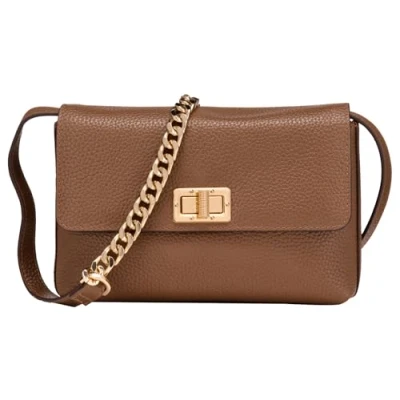 Contemporary Clasp with flap and knurled twist clasp Interior: pocket closure with zip Adjustable and removable leather shoulder strap and narrow metal chain