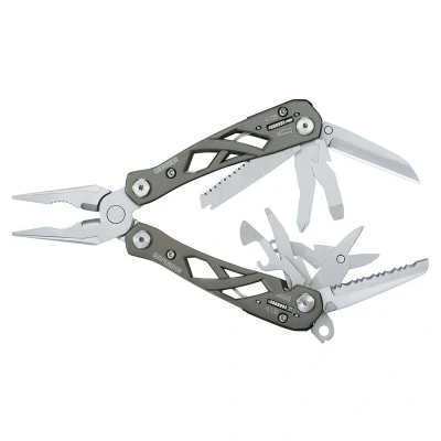 General description The Gerber Suspension Multi Tool is the benchmark tool of convenience and durability. The easily accessed butterfly design features a lightweight frame for long days and tired hands, inspired by the bridges of Gerber’s hometown in Portland, Oregon. Technical specifications Overall Length: 165 mm Closed Length: 102 mm Blade Length: 5.1 cm Weight: 272.1 g Usage Needle nose pliers (spring loaded) 'V-Cut' wire cutters Scissors Fine blade Serrated blade Saw Phillips screwdriver Small flat screwdriver Medium flat screwdriver Bottle opener Can opener Lanyard ring