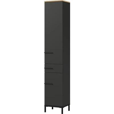 Mounted dimensions approx.: 34 x 190 x 34 cm (WxHxD) Cabinet with one drawer (load capacity up to 10 kg) and two doors - behind it a total of three adjustable shelves (load capacity up to 10 kg); bottom shelf in black (load capacity up to 15 kg); top shelf in Navarra oak repro. Furniture made of chipboard with scratch-resistant and hard-wearing surface coating. Bottom shelf in black, top shelf in Navarra oak repro, rest in graphite; three bar handles and four high metal feet in black Scratch-resistant and hard-wearing surface coating, Shock and impact-resistant edges, Adjustable shelves for individual design, Soft-closing drawers, Soft-closing doors, With metal bar handles, With metal feet, Doors can be fitted on the right or left All Germania furniture is developed and manufactured in Germany. They are supplied with an anti-tilt protection (only screws and dowels must be purchased separately depending on the wall condition).