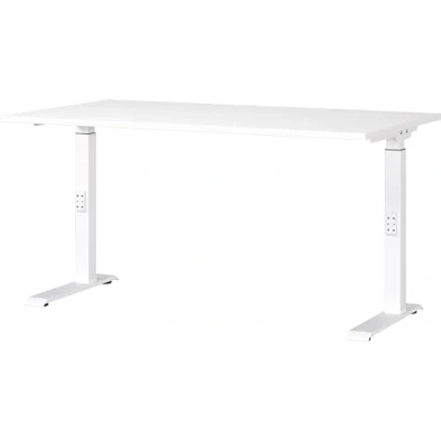 Assembled dimensions approx. 140 x 91 x 80 cm (WxHxD) Mechanically height-adjustable desk with two C-feet; table top (can hold up to 80 kg), height adjustable from 68-91 cm Melamine resin-coated chipboard top in white, powder-coated metal frame in white Scratch-resistant and durable surface coating, shock-resistant and impact-resistant edges, ergonomic table with mechanical height adjustment, choice of different colors possible, environmentally friendly, packaged without styrofoam All Germania furniture is developed and manufactured in Germany.