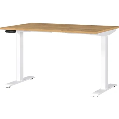 Assembled dimensions approx. 120 x 120 x 80 cm (WxHxD) Electrically height-adjustable desk with two T-feet; table top (can hold up to 80 kg), height adjustable from 72-120 cm Top made of melamine resin-coated chipboard in the color Grandson Oak-Nb, powder-coated metal frame in white Scratch-resistant and durable surface coating, shock-resistant and impact-resistant edges, ergonomic table with electrical height adjustment, choice of different colors possible, environmentally friendly, packaged without styrofoam. All Germania furniture is developed and manufactured in Germany.