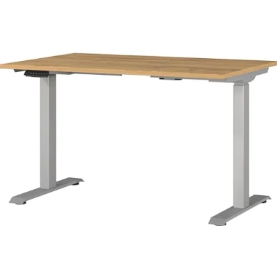 Assembled dimensions approx. 120 x 120 x 80 cm (WxHxD) Electrically height-adjustable desk with two T-feet; table top (can hold up to 80 kg), height adjustable from 72-120 cm Melamine resin-coated chipboard top in the color Grandson Oak Nb., powder-coated metal frame in silver Scratch-resistant and durable surface coating, shock-resistant and impact-resistant edges, ergonomic table with electrical height adjustment, choice of different colors possible, environmentally friendly, packaged without styrofoam. All Germania furniture is developed and manufactured in Germany.
