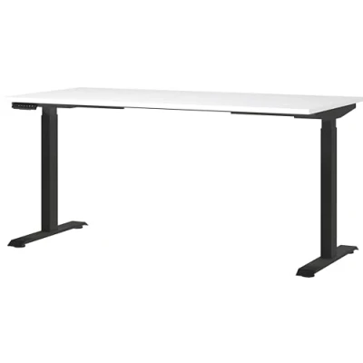 Assembled dimensions approx. 160 x 120 x 80 cm (WxHxD) Electrically height-adjustable desk with two T-feet; table top (can hold up to 80 kg), height adjustable from 72-120 cm Melamine resin-coated chipboard top in white, powder-coated metal frame in black Scratch-resistant and durable surface coating, shock-resistant and impact-resistant edges, ergonomic table with electrical height adjustment, choice of different colors possible, environmentally friendly, packaged without styrofoam. All Germania furniture is developed and manufactured in Germany.
