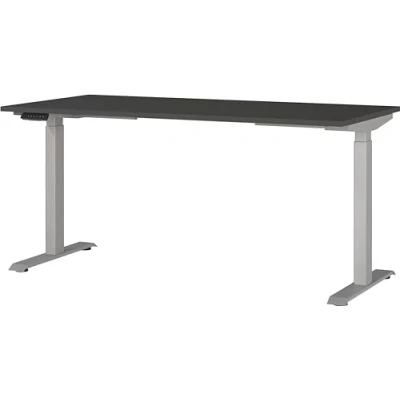 Assembled dimensions approx. 160 x 120 x 80 cm (WxHxD) Electrically height-adjustable desk with two T-feet; table top (can hold up to 80 kg), height adjustable from 72-120 cm Top base made of melamine resin-coated chipboard in the color graphite, frame made of powder-coated metal in silver Scratch-resistant and durable surface coating, shock-resistant and impact-resistant edges, ergonomic table with electrical height adjustment, choice of different colors possible, environmentally friendly, packaged without styrofoam. All Germania furniture is developed and manufactured in Germany.