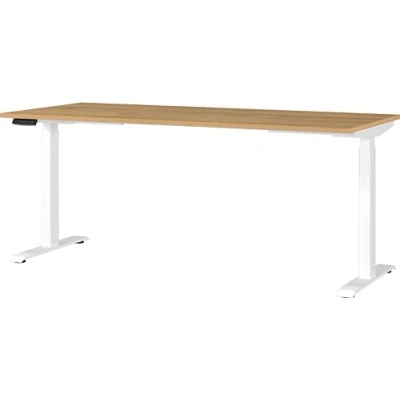 Assembled dimensions approx. 180 x 120 x 80 cm (WxHxD) Electrically height-adjustable desk with two T-feet; table top (can hold up to 80 kg), height adjustable from 72-120 cm Top made of melamine resin-coated chipboard in the color Grandson Oak-Nb, powder-coated metal frame in white Scratch-resistant and durable surface coating, shock-resistant and impact-resistant edges, ergonomic table with electrical height adjustment, choice of different colors possible, environmentally friendly, packaged without styrofoam. All Germania furniture is developed and manufactured in Germany.