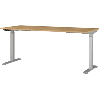 Assembled dimensions approx. 180 x 120 x 80 cm (WxHxD) Electrically height-adjustable desk with two T-feet; table top (can hold up to 80 kg), height adjustable from 72-120 cm Melamine resin-coated chipboard top in the color Grandson Oak Nb., powder-coated metal frame in silver Scratch-resistant and durable surface coating, shock-resistant and impact-resistant edges, ergonomic table with electrical height adjustment, choice of different colors possible, environmentally friendly, packaged without styrofoam. All Germania furniture is developed and manufactured in Germany.