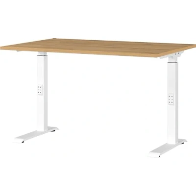 Assembled dimensions approx. 120 x 91 x 80 cm (WxHxD) Mechanically height-adjustable desk with two C-feet; table top (can hold up to 80 kg), height adjustable from 68-91 cm Top made of melamine resin-coated chipboard in the color Grandson Oak-Nb, powder-coated metal frame in white Scratch-resistant and durable surface coating, shock-resistant and impact-resistant edges, ergonomic table with mechanical height adjustment, choice of different colors possible, environmentally friendly, packaged without styrofoam All Germania furniture is developed and manufactured in Germany.