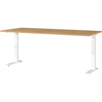 Assembled dimensions approx. 180 x 91 x 80 cm (WxHxD) Mechanically height-adjustable desk with two C-feet; table top (can hold up to 80 kg), height adjustable from 68-91 cm Top made of melamine resin-coated chipboard in the color Grandson Oak-Nb, powder-coated metal frame in white Scratch-resistant and durable surface coating, shock-resistant and impact-resistant edges, ergonomic table with mechanical height adjustment, choice of different colors possible, environmentally friendly, packaged without styrofoam All Germania furniture is developed and manufactured in Germany.