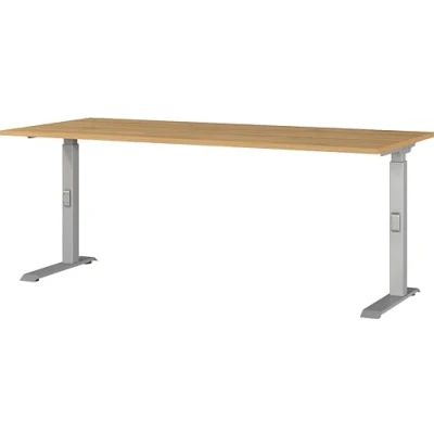 Assembled dimensions approx. 180 x 91 x 80 cm (WxHxD) Mechanically height-adjustable desk with two C-feet; table top (can hold up to 80 kg), height adjustable from 68-91 cm Melamine resin-coated chipboard top in the color Grandson Oak Nb., powder-coated metal frame in silver Scratch-resistant and durable surface coating, shock-resistant and impact-resistant edges, ergonomic table with mechanical height adjustment, choice of different colors possible, environmentally friendly, packaged without styrofoam All Germania furniture is developed and manufactured in Germany.