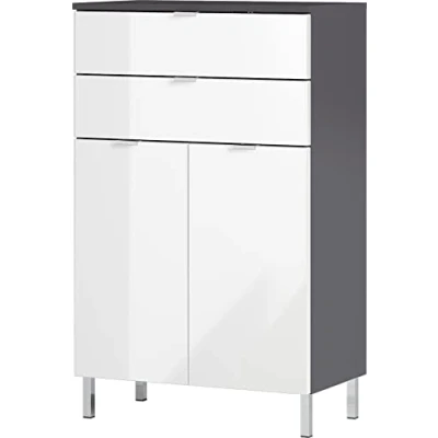 Mounted dimensions: approx. 60 x 97 x 34 cm (w/h/d) Chest of drawers with two drawers and two doors - behind them two adjustable shelves. Drawers, shelves and top panel each loadable up to 10 kg. Body melamine reisn coated chipboard in graphite, fronts thermoformed MDF in white high-gloss. Edge handles and feet in chrome metal, high-quality ABS edges, door damping, self-closing drawers Made in Germany