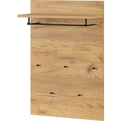 Assembled dimensions: W/H/D 75/110/30 cm Wardrobe panel with a shelf, a clothes rail and five coat hooks, shelf and clothes rail can hold up to 10 kg and coat hooks up to 3 kg each Melamine resin coated chipboard in Navarra oak replica, high-quality ABS edges Clothes rail and coat hook made of metal in black All furniture from Germania is developed and manufactured in Germany. They are supplied with wall mounting (only screws and dowels must be purchased and used separately according to the nature of the wall)