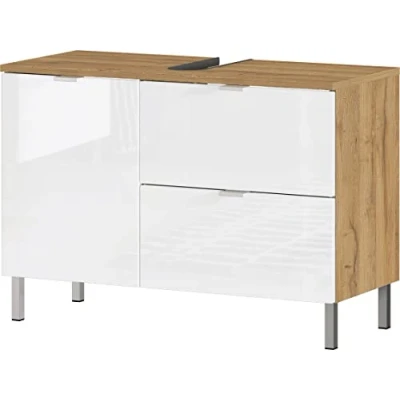 Mounted dimensions: approx. 80 x 56 x 34 cm (w/h/d) Washbasin base cabinet with one flap on the right, beneath a drawer and one door on the left - behind it an adjustable shelf. Top shelf with recess for siphon. Flap, drawer and shelf each loadable up to 10 kg. Body melamine reisn coated chipboard in Grandson-oak repro, fronts thermoformed MDF in white high-gloss. Edge handles and feet in chrome metal, high-quality ABS edges, door damping, self-closing drawers Made in Germany