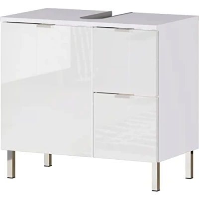 Mounted dimensions: approx. 60 x 56 x 34 cm (w/h/d) Washbasin base cabinet with two drawers on the right and one door on the left - behind it an adjustable shelf. Top shelf with recess for siphon. Drawers and shelf each loadable up to 10 kg. Body melamine reisn coated chipboard in white, fronts thermoformed MDF in white high-gloss. Edge handles and feet in chrome metal, high-quality ABS edges, door damping, self-closing drawers Made in Germany