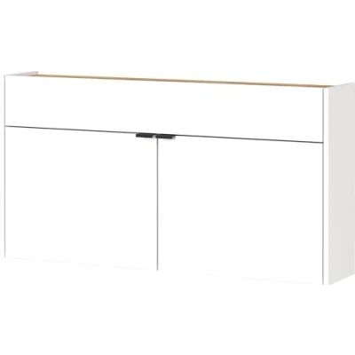Mounted dimensions approx. 110 x 57 x 22 cm (WxHxD) Multi-purpose cabinet (FSC certified) with one divided drawer (can hold up to 3 kg on each side) and two doors, behind which there is a central panel and a total of 4 adjustable shelves (can hold up to 5 kg each). Top shelf can hold up to 7 kg, bottom shelf up to 10 kg Top shelf, shelves and rear panel in Navarra-oak repro, rest in white. Two powder-coated metal edge handles in black Scratch-resistant surface coating, impact-resistant edges, shallow depth - ideal for narrow hallways, scratch-resistant and hard-wearing surface coating, impact and shock-resistant edges, shallow depth - ideal for narrow hallways, suspended installation, doors close slowly, gently and silently thanks to integrated damper, environmentally friendly, packed without styrofoarm All Germania furniture is developed and manufactured in Germany. They are supplied including wall mounting (only screws and dowels have to be purchased separately depending on the wall condition).
