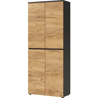 Mounted dimensions approx. 80 x 197 x 40 cm (W/H/D) Filing cabinet with two doors, behind them four adjustable shelves (each loadable up to 22 kg), bottom shelf loadable up to 30 kg. Body in graphite, fronts in Navarra-oak repro. Scratch-resistant and durable surface coating, Shock and impact resistant edges, Adjustable shelves for individual design, Doors close slowly, gently and silently due to integrated damper, Handleless design All Germania furniture is developed and manufactured in Germany. They are supplied with an anti-tilt protection (only screws or hooks and dowels must be purchased separately depending on the wall condition).