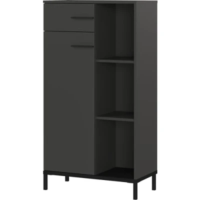 Mounted dimensions approx. 64 x 120 x 34 cm (W/H/D) Filing cabinet with one drawer and one door, behind it two fixed shelves (each loadable up to 10 kg), creating two compartments (each loadable up to 10 kg) at file height; door closes only 2/3 of the cabinet, creating three open compartments; top shelf loadable up to 10 kg, bottom shelf loadable up to 15 kg Body, shelves and fronts in Graphite, base in Black metal look. Feet an bar handles made of powder-coated metal in Black Scratch-resistant and durable surface coating, Shock and impact resistant edges, Metal rack handles, With metal feed, Doors can be hinged both right and left, Doors close slowly, gently and silently due to integrated damper, Eco friendly packed, without styrofoam All Germania furniture is developed and manufactured in Germany. They are supplied with an anti-tilt protection (only screws or hooks and dowels must be purchased separately depending on the wall condition).