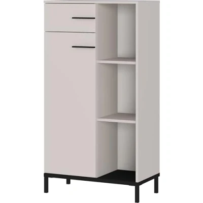 Mounted dimensions approx. 64 x 120 x 34 cm (W/H/D) Filing cabinet with one drawer and one door, behind it two fixed shelves (each loadable up to 10 kg), creating two compartments (each loadable up to 10 kg) at file height; door closes only 2/3 of the cabinet, creating three open compartments; top shelf loadable up to 10 kg, bottom shelf loadable up to 15 kg Body, shelves and fronts in Cashmere, base in Black metal look. Feet an bar handles made of powder-coated metal in Black Scratch-resistant and durable surface coating, Shock and impact resistant edges, Metal rack handles, With metal feed, Doors can be hinged both right and left, Doors close slowly, gently and silently due to integrated damper, Eco friendly packed, without styrofoam All Germania furniture is developed and manufactured in Germany. They are supplied with an anti-tilt protection (only screws or hooks and dowels must be purchased separately depending on the wall condition).