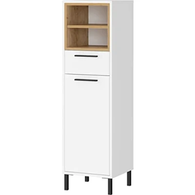 Mounted dimensions approx. 34 x 119 x 34 cm (W x H x D) Medium cabinet with one drawer, one door and two open compartments. Behind the door one adjustable shelf. Shelf, comaprtments an top shelf each loadable up to 10 kg. Body and fronts melamine coated chipboard. Body an Fronts in white, open compartments in Navarra-oak decor. Bar handle and feets made of powder-coated metal in the color black. Resistant surface coating made of melamine, door and drawer close slowly, gently and silently due to integrated damper, adjustable shelf for individual design, shock-resistant ABS edges, metal rack handles, door can be hinged both right and left All Germania furniture is developed and manufactured in Germany. They are supplied with an anti-tipper (only screws and dowels have to be purchased separately depending on the wall condition).