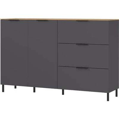 Mounted dimensions approx.: 151 x 98 x 40 cm (WxHxD) Sideboard with three drawers (load capacity up to 10 kg) and two doors, each with an adjustable shelf behind it (load capacity up to 10 kg); bottom shelf load capacity up to 15 kg, top shelf up to 30 kg; 8 mm top panel in Navarra oak repro. Furniture made of chipboard with scratch-resistant and durable surface coating. Body and fronts in graphite, 8 mm top panel in Navarra oak repro; six high, powder-coated metal feet in black, plus six black furniture glides; five edge handles in powder-coated metal in black. Scratch-resistant and hard-wearing surface coating, Shock and impact-resistant edges, Soft-closing doors, Soft-closing drawers, Adjustable shelves for individual design, With metal edge handles, With metal feet All Germania furniture is developed and manufactured in Germany. They are supplied with an anti-tilt protection (only screws and dowels must be purchased separately depending on the wall condition).