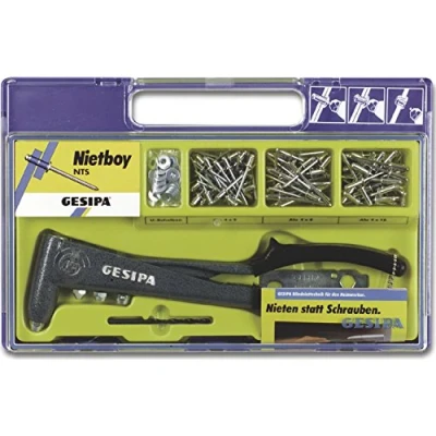 Working range up to 5 mm Ø for Aluminium and up to 4 mm Ø for steel and stainless steel Slim design of tool for access to difficult riveting places Content: Hand riveter NTS, 4 nosepieces 10/18; 10/24; 10/27; 10/32, blind rivets aluminium/steel 4 x 6; 4 x 8; 4 x 12 mm, Weight: 2.6014546916 Pounds, Manufacturer: Gesipa