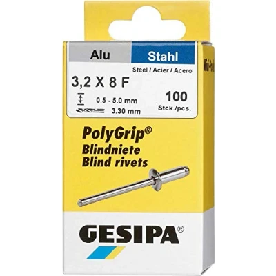 Originally developed as a multi-area blind rivet, the GESIPA PolyGrip has developed a lot of other talents in its career, which now make it a favourite when it comes to fulfilling difficult and demanding applications in the industrial environment Whether in aluminium, steel or stainless steel, indoors or outdoors, with hard or soft joints, critical hole diameter and tolerances: if no one else can do it, the GESIPA PolyGrip is almost always the saving solution A PolyGrip blind rivet has such a large clamping range that it can replace up to five different dimensions of DIN standard blind rivets Another advantage is the excellent hole closure. This means that the rivet shaft deformes radially during the setting process, thus compensating for borehole inaccuracies, center offset and diameter differences to form a play-free and tight connection Technical details: rivet shaft diameter 3.2 mm, shear force 720 N, tensile force 1050 N, flat round head, drill hole diameter 3.3 mm, material rivet mandrel galvanised steel, material hollow rivet aluminium alloy, set head diameter max. 6.5 mm, clamping range 0.5-5.0 mm, rivet shaft length 8 mm, Weight: 0.110231131 Pounds, Manufacturer: GESIPA