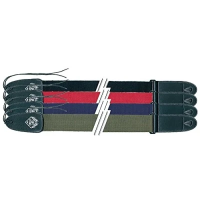 Woven nylon guitar strap with 5mm faux leather ends Width: 5 cm Length adjustable with plastic buckle Reinforced strap button Red Woven nylon-guitar strap with 5 mm thick artificial leather ends Width 5cm Length adjustable through synthetic clasp Buttonhole reinforced seam