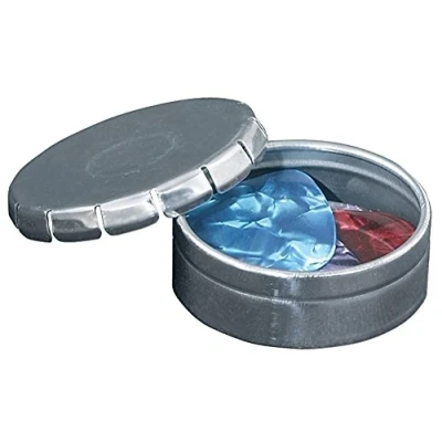 Small metal box with detachable lid round, 40 mm Ø, Height 15 mm with 10 picks Nickel plated finish