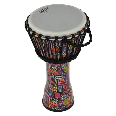 High-quality craftsmanship: GEWA Liberty Djembe with a robust PVC body for exceptional durability and easy handling. Optimal sound quality: Equipped with synthetic fiber head, it delivers clear and powerful tones, suitable for beginners and professionals. Fixed rope tuning: Equipped with 25 Rope Runners, the djembe is already professionally tuned. Optimal size:: Diameter: 10" (25.4 cm), height: 19.5" (49 cm). For on the go: Weighs only 1.99 kg and impresses in the pattern Abstract, suitable for travel and performances.