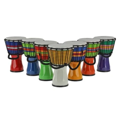High-quality craftsmanship: GEWA Liberty Djembe with a robust PVC body for exceptional durability and easy handling. Optimal sound quality: Equipped with synthetic fiber head, it delivers clear and powerful tones, suitable for beginners and professionals. Fixed rope tuning: Equipped with 14 Rope Runners, the djembe is already professionally tuned. Optimal size: Diameter: 7" (17.8 cm), height: 12.5" (31.5 cm). For on the go: The set weighs only 7.4 kg and consists of 7 djembes in the colours: white, purple, orange, blue, yellow, red, green. Suitable for travel and performances.