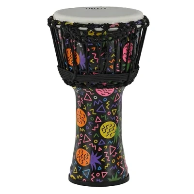 High-quality craftsmanship: GEWA Liberty Djembe with a robust PVC body for exceptional durability and easy handling. Optimal sound quality: Equipped with synthetic fiber head, it delivers clear and powerful tones, suitable for beginners and professionals. Fixed rope tuning: Equipped with 20 Rope Runners, the djembe is already professionally tuned. Optimal size: Diameter: 8" (20.3 cm), height: 16.5" (41.2 cm). For on the go: Weighs only 1.5 kg and impresses in the pattern Pineapple, suitable for travel and performances.