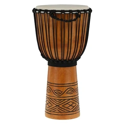 High-quality craftsmanship: GEWA Liberty Djembe with a body made of high-quality mahogany wood with artistic decoration for an appealing appearance. Authentic sound: Equipped with carefully selected goat skin head for warm, full tones and traditional sound quality. Fixed rope tuning: Equipped with 21 Rope Runners, the djembe is already professionally tuned. Optimal size: Diameter: 12" (28.5 cm), Height: 23.5" (60 cm). For on the go: Weighs 6.45 kg and impresses with its natural look, suitable for travel and performances.