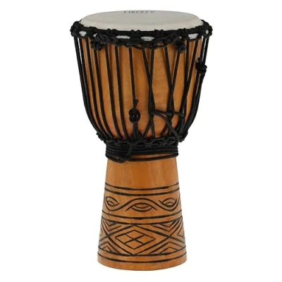 High-quality craftsmanship: GEWA Liberty Djembe with a body made of high-quality mahogany wood with artistic decoration for an appealing appearance. Authentic sound: Equipped with carefully selected goat skin head for warm, full tones and traditional sound quality. Fixed rope tuning: Equipped with 16 Rope Runners, the djembe is already professionally tuned. Optimal size: Diameter: 8" (20.3 cm), Height: 16" (40.5 cm). For on the go: Weighs only 2.0 kg and impresses with its natural look, suitable for travel and performances.