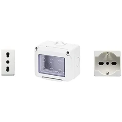 Content: Nr. 1 Schuko socket, Nr. 1 Bivalent socket Container 2 seats protection grade IP40. Modules color white 27 COMBI is a complete and versatile system of modular modular containers, perfectly integrated into the SYSTEM civil series, which is able to meet the installation needs of high protection of the residential, tertiary and industrial sectors. The 27 COMBI series is available both in IP40 and in watertight versions with IP55 and IP65 protection, recommended for all outdoor applications under harsh weather conditions. Series Gewiss 27 COMBI 3 Modules