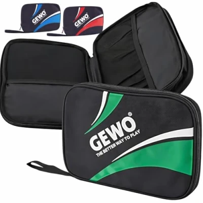 Heavy duty square double cover with space for 2 table tennis bats The case is made from durable nylon Durable and high quality zip. Modern design including comfortable carry strap 2 padded racket compartments for maximum protection