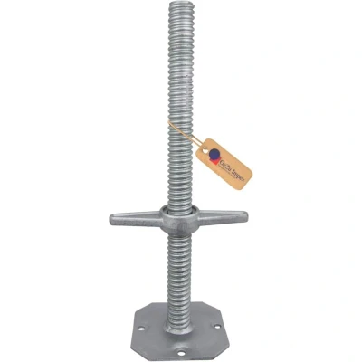ManoManoOur adjustable galvanized screw solid stem with base plate is designed to provide reliable stability on uneven ground. These scaffold swivel screw jacks allow for safe and precise horizontal setup within the adjustment range, ensuring scaffolds remain level and secure. Why choose these adjustable galvanized screw solid stem spindles • Ideal for scaffolding construction on uneven surfaces, offering stable support • Scaffold swivel screw jacks allow for easy and secure horizontal adjustment within the range • Designed to fit scaffolding with a 4.83 cm tube diameter, with a 38 mm diameter for leveling feet • Available in multiple lengths: 300 mm, 500 mm, 600 mm, 650 mm, 800 mm, 950 mm, and 1000 mm for flexible usage Key features and usability • Base plate measures 150 × 150 mm with four perforated holes (10 mm, 11 mm, 15 mm, and 17 mm) for secure anchoring to the floor • Constructed from hot-dip galvanized steel for enhanced durability and corrosion resistance • Meets DIN 4425 standards
