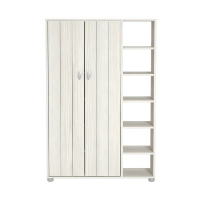 Bed KingsBIDEFORD TALL SHOE CABINET WHITE by GFW. Designed to look the part and made to last Ñ Keep your hallway or bedroom tidy with this stylish and practical shoe cabinet. It has two doors and open shelves, giving you a mix of hidden and visible storage. The cabinet holds up to 12 pairs of shoes with a maximum shoe size of UK 8. Made from strong engineered wood with a natural wood finish, itÕs built to last and looks great in any room. The raised legs keep it off the ground and make cleaning easier. Compact yet spacious, it fits well in smaller spaces and is easy to assemble. Size: W79.6 x D29.6 x H119.5 cm.. Crafted from particle board Finish: Paper Foil Colour: White Includes clear assembly instructions Product Details Dimensions: 119.5cm (H) x 79.6cm (W) x 29.6cm (D) Material: Particle Board Finish: Paper Foil Colour: White Finish the look with pieces from our bedroom furniture. Explore more in living room furniture.