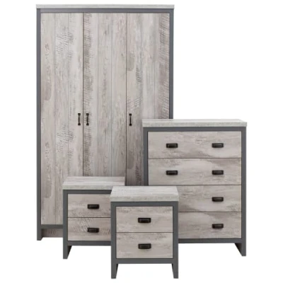 IN THE SET: It's easy to create a bedroom that showcases effortless chic, with this stylish 4-piece furniture pack. The rustic-inspired design exudes understated elegance. Comprising a three-door High wardrobe, four-drawer chest and bedside table. DESIGN: The Boston Bedroom furniture bundle with its dark grey Finish and distressed oak and brushed steel handles. it matches perfectly with the rest of the Boston living range so your bedroom can match your kitchen, hallway and living room. A well-thought-out mix of hanging, drawer and flat shelf that's suitable for any bedroom storage. STORAGE : The set features a chest of drawers unit, perfect to house your clothing, shoes and accessories. The set also includes two small narrow bed side table for easy access storage in the bed room. The large wardrobe includes storage shelving on top of the clothes hanging rail, for extra shelving storage. This set is the perfect organiser for bedroom accessories. DIMENSIONS: Wardrobe fully assembled dimensions of (W)790 x (D)520 x (H)1800mm, Chest Of Drawers: (W)790 x (D)395 x (H)950mm & 2 grey bedside table: (W)450 x (D)395 x (H)482mm. Full assembly required. (instructions included). GFW: Find a bedroom range to match your personality; From complete bedroom cabinet furniture sets to individual lines our Bedrooms collections cover on-trend muted pastels through to vibrant pops of colour. Bring your vision to life with GFW modern bedroom collections. This wardrobe set is part of the Boston collection providing aspirational designs for every home.
