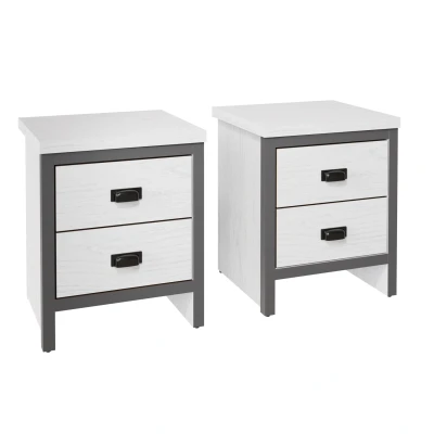 BOSTON 2 DRAWER BEDSIDE TABLE PAIR WHITE by GFW. Designed to look the part and made to last. Give your bedroom a makeover with the stylish Boston Bedroom Range. The industrial-inspired design of the Boston is a good match for a contemporary interior, offering a pared-back, reclaimed-effect look and feel that reflects the urban aesthetic. The bedside table provides effective storage with 2 neat storage drawers allowing you to keep the top panel neat and tidy. Crafted from particle board Finish: Paper Foil Colour: White Includes clear assembly instructions Product Details Dimensions: 52.2cm (H) x 43cm (W) x 39.3cm (D) Material: Particle Board Finish: Paper Foil Colour: White Assembly: Self-assembly, 15 steps Finish the look with pieces from our drawers. Explore more in bedroom furniture.